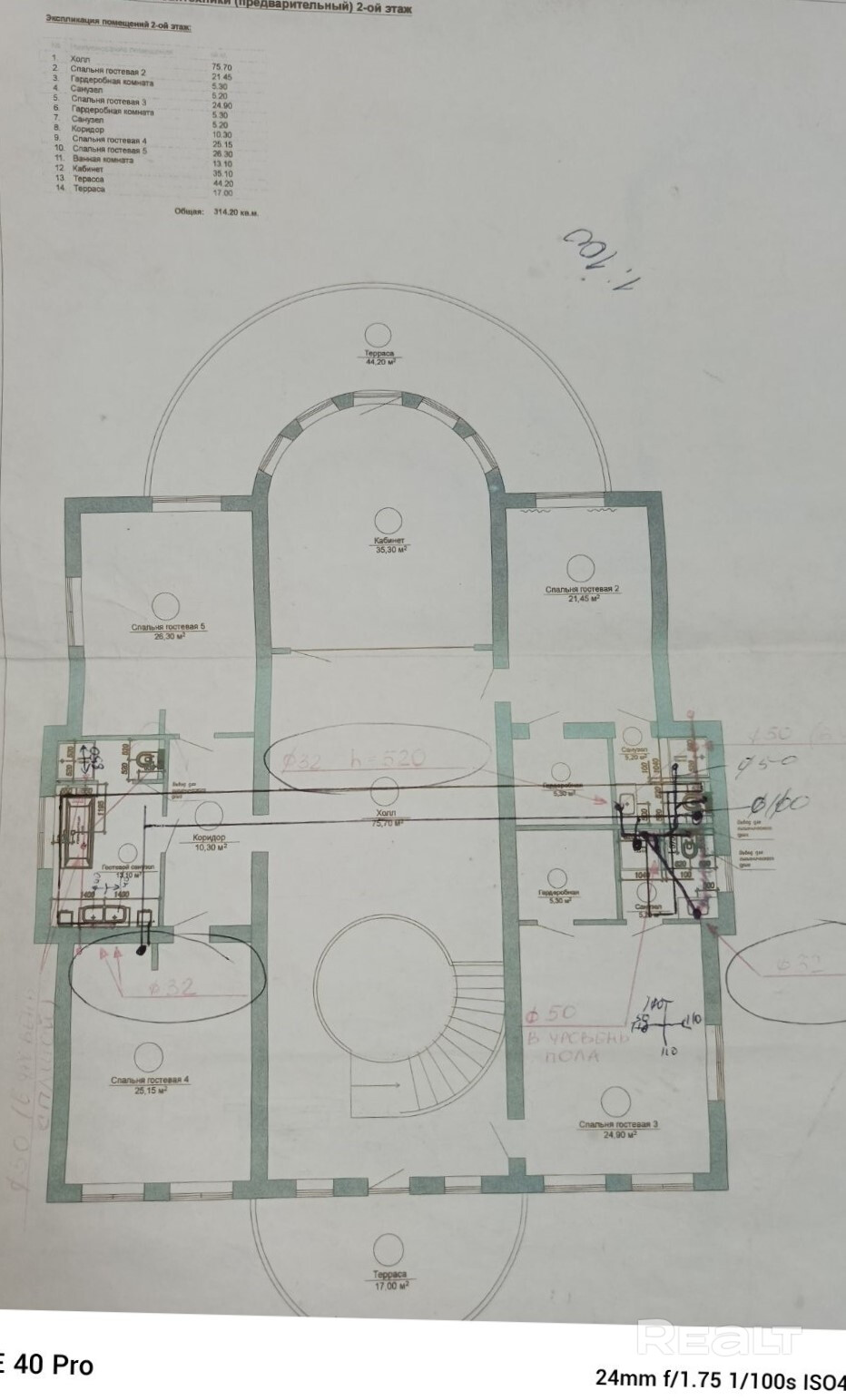 - 2-й этаж – 4 комнаты: 2-е мастер спальни (21,45 м2 и 24,90 м2) с санузлами и гардеробом + 2-е спальни (25 и 26 м2) с общим санузлом + холл 110 м2 + 2 террасы.