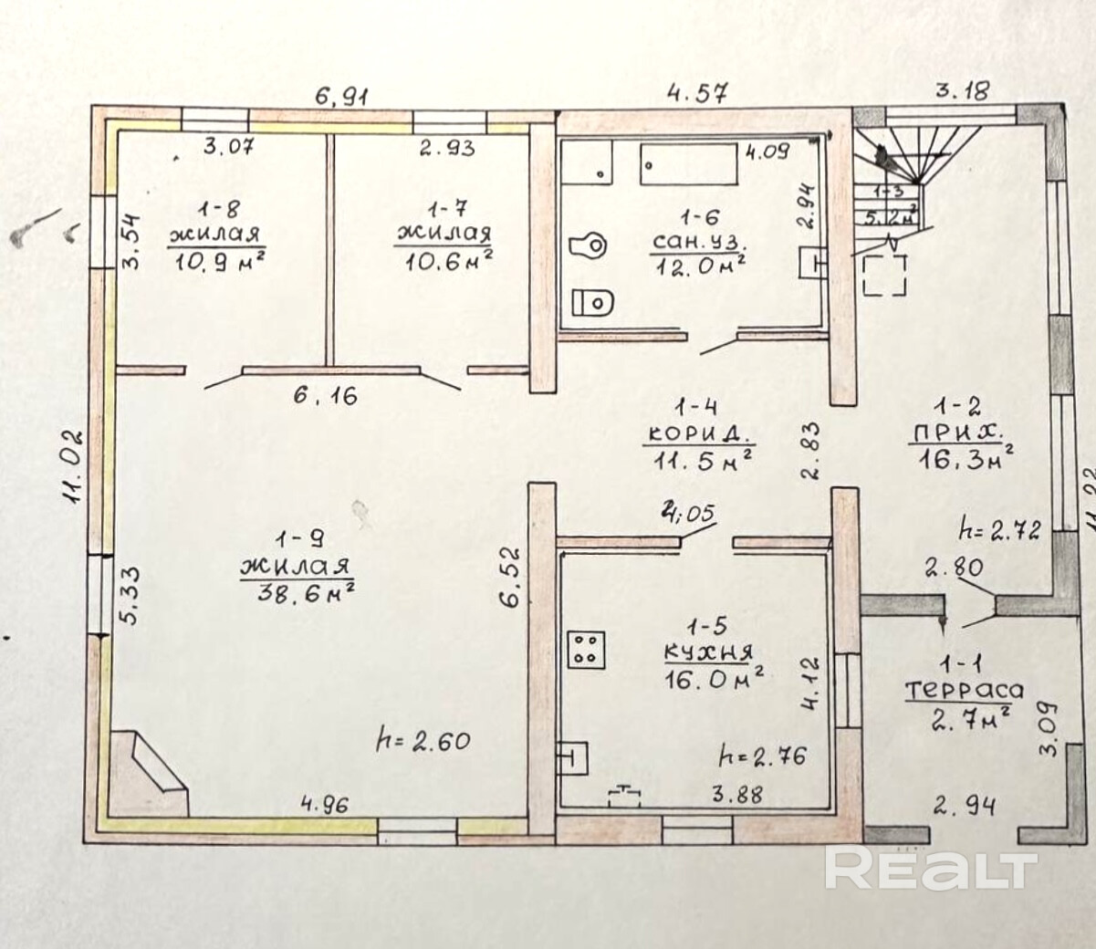 1. Первый этаж, состоит из просторной гостиной (38.6 кв.м.) в которой расположен камин и зона отдыха, кухни с кухонным гартитуром и техникой (16.0 кв.м.), двух жилых комнат (10.9 кв.м. и 10.6 кв.м.), большого сан.узела и прихожей с шикарной лестницей.