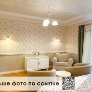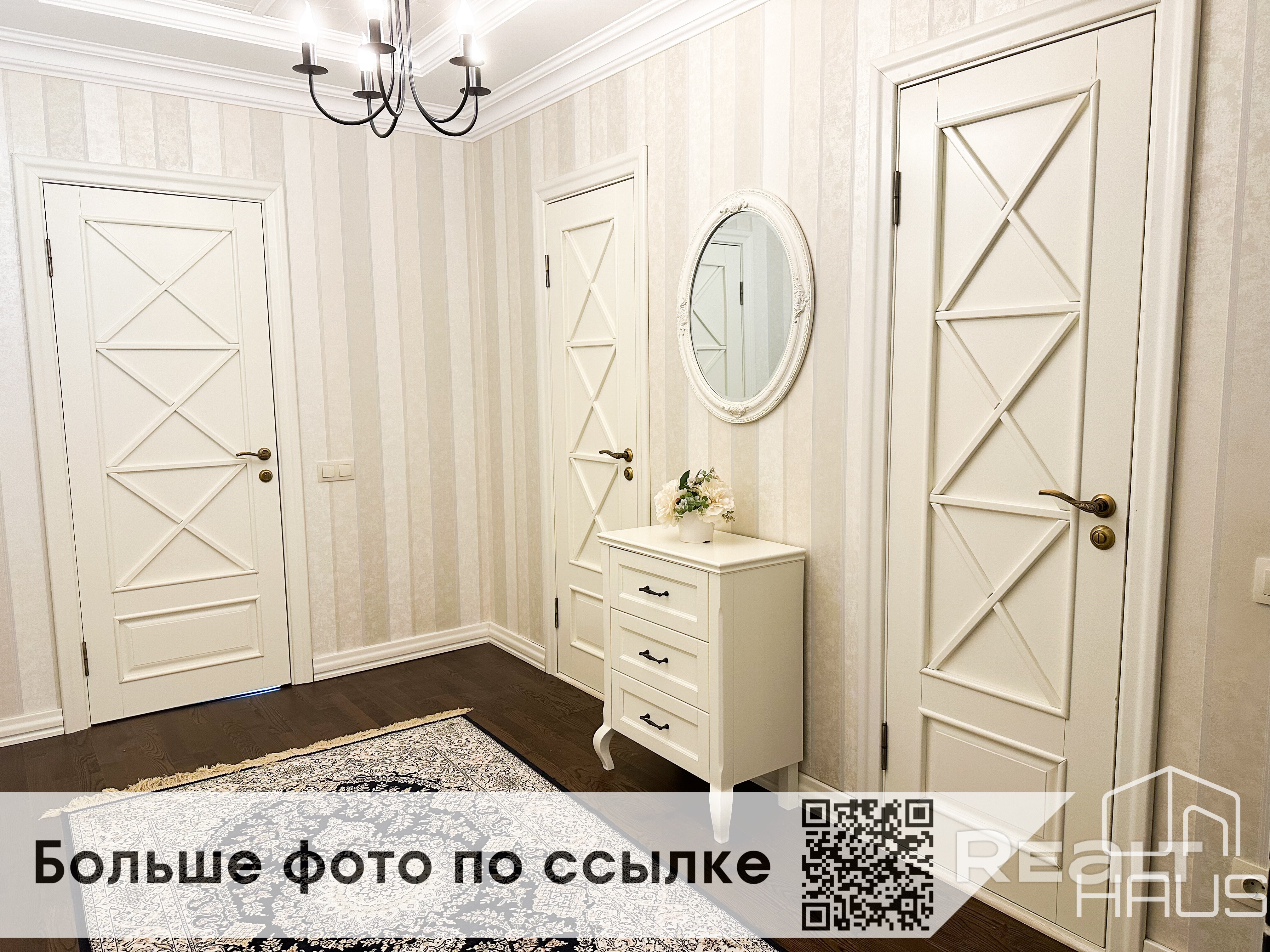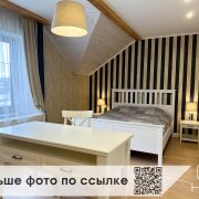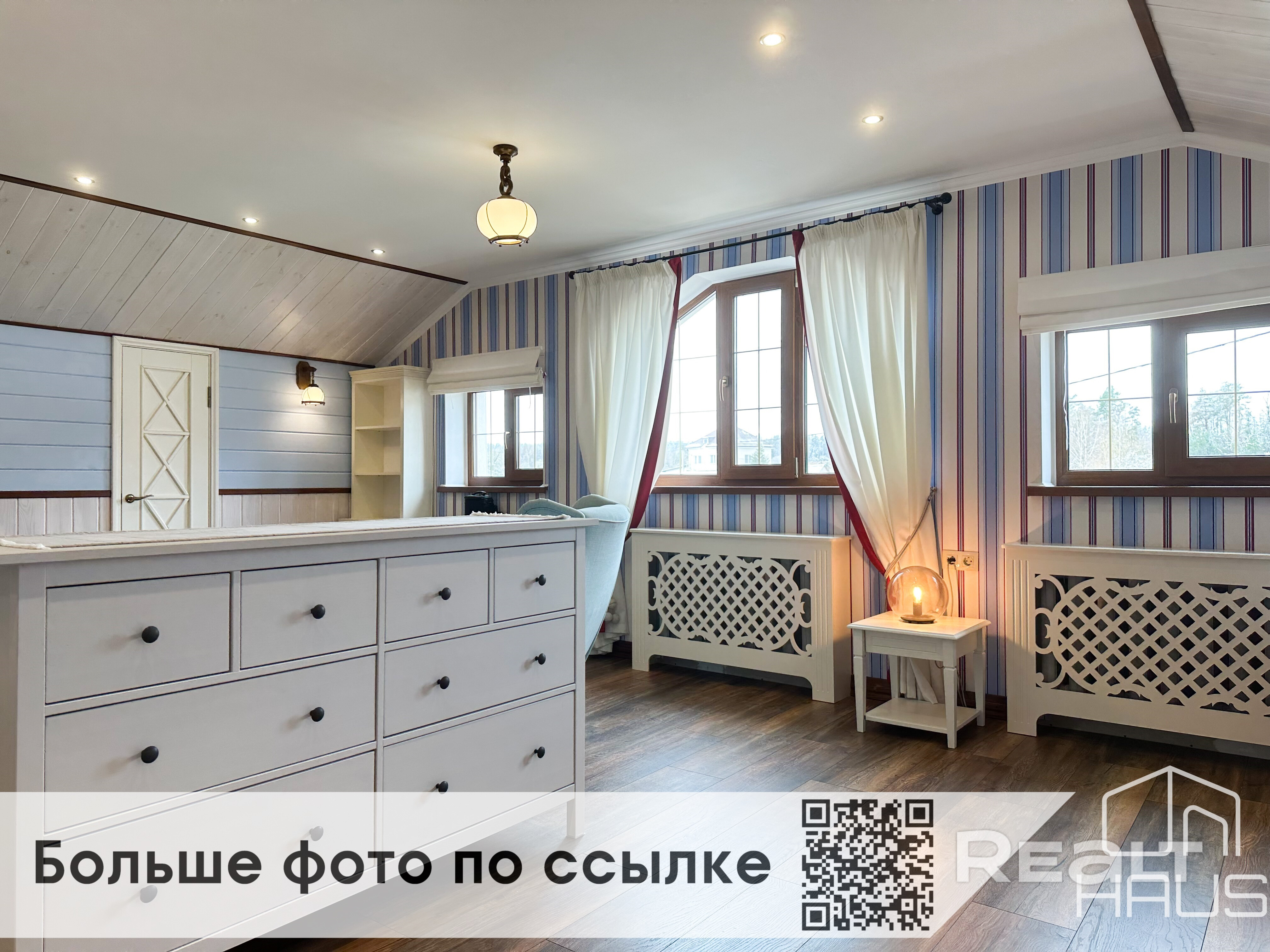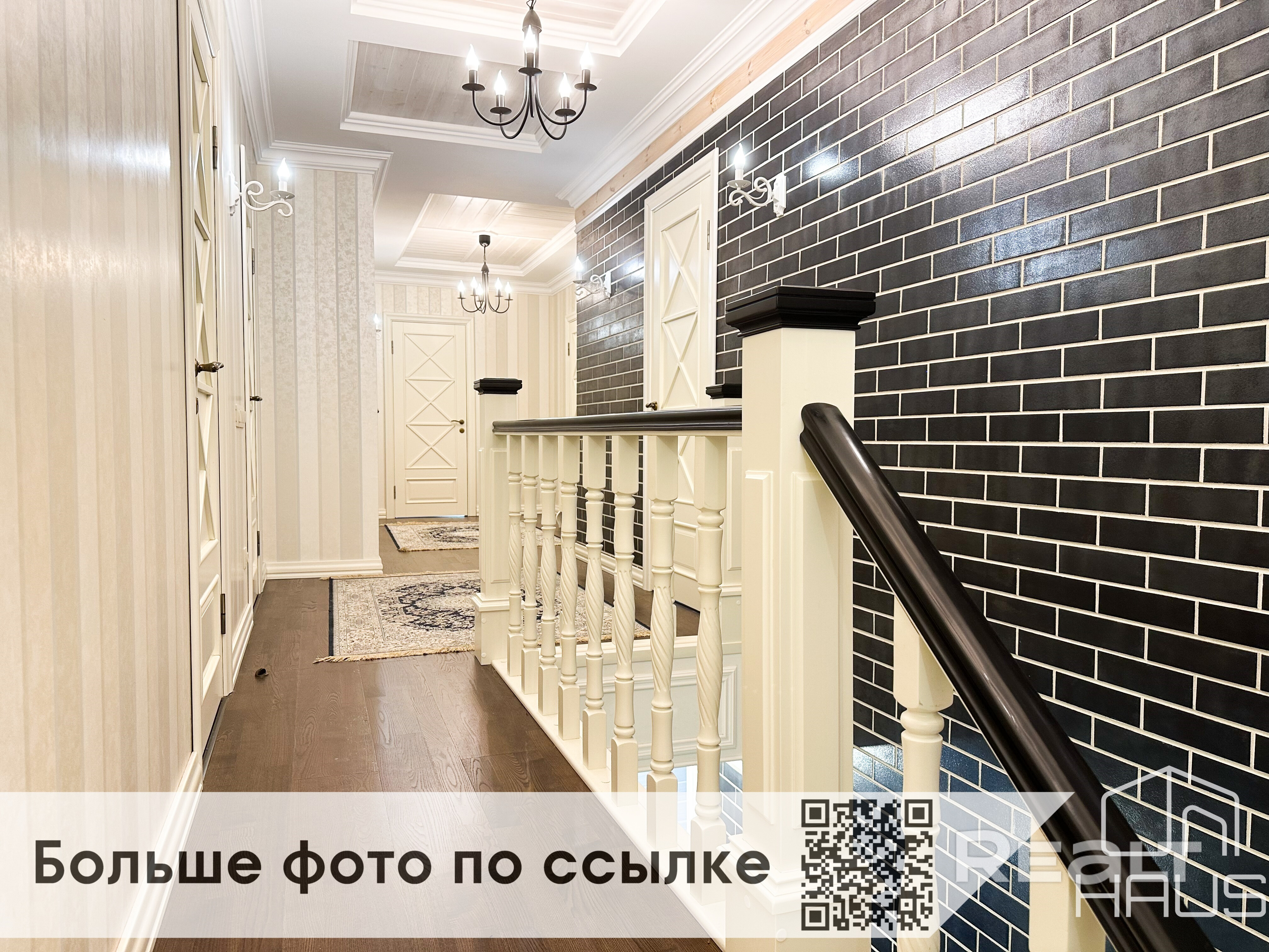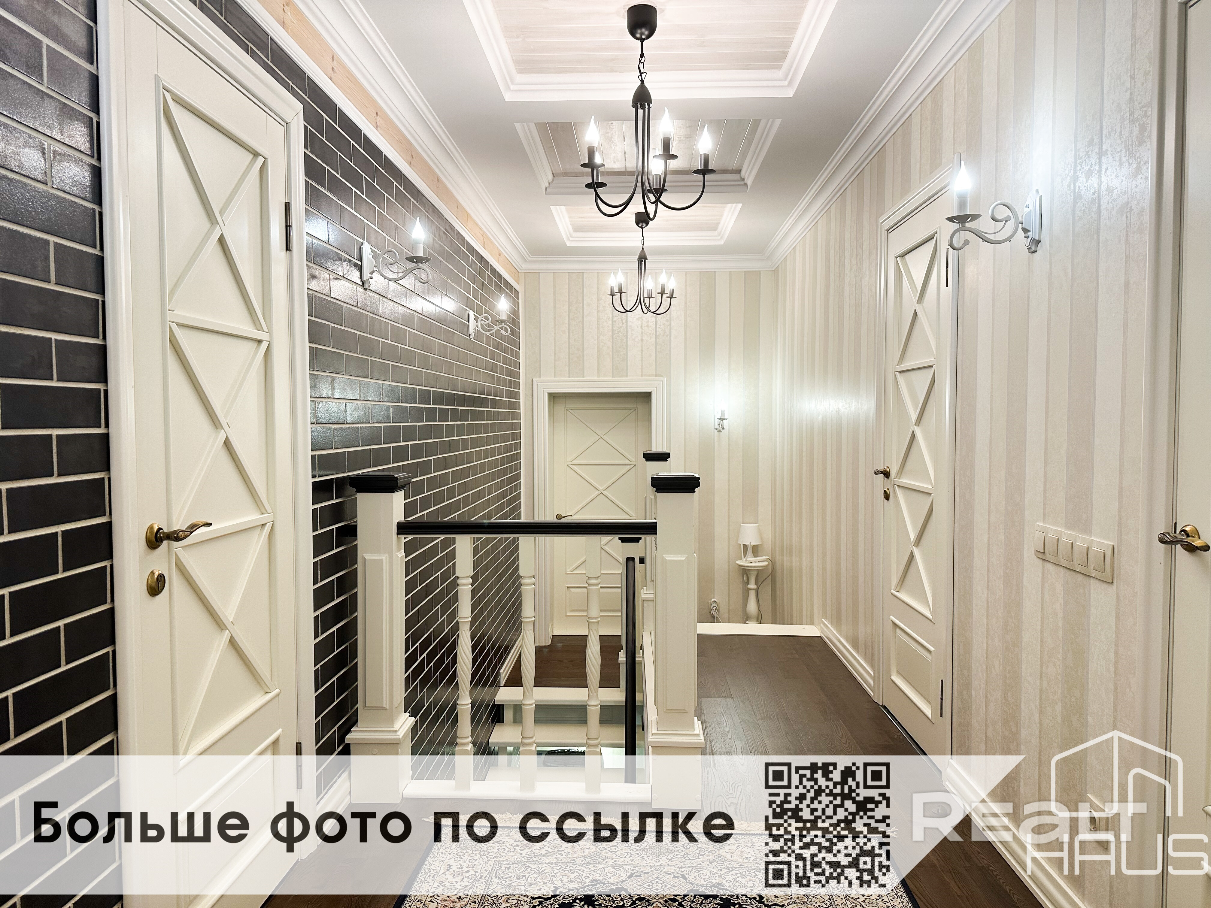 На первом этаже расположена просторная кухня, совмещённая со столовой зоной, светлая гостиная, котельная, гараж, санузел и кабинет. Второй этаж включает шесть просторных спален, два санузла, две гардеробные комнаты и балкон с великолепными видами на окружающую природу.