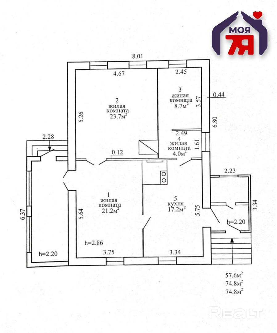 - Дом кирпичный, общая площадь которого 74,8 кв.м.