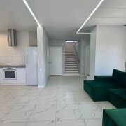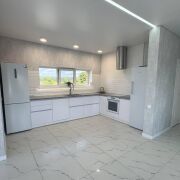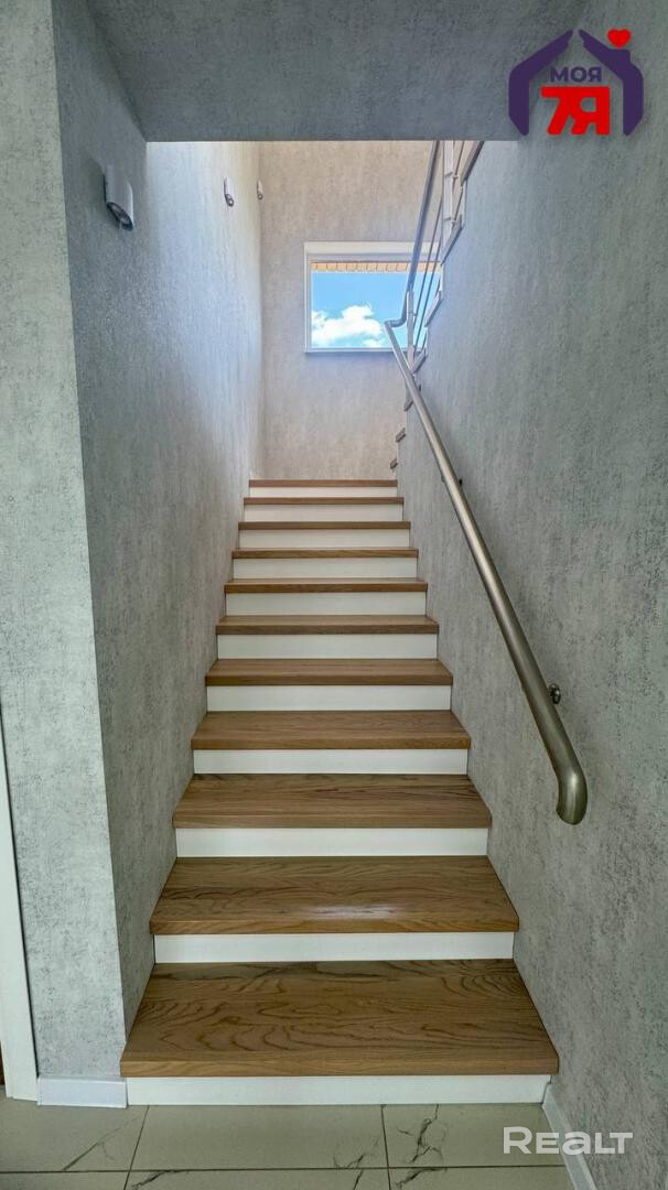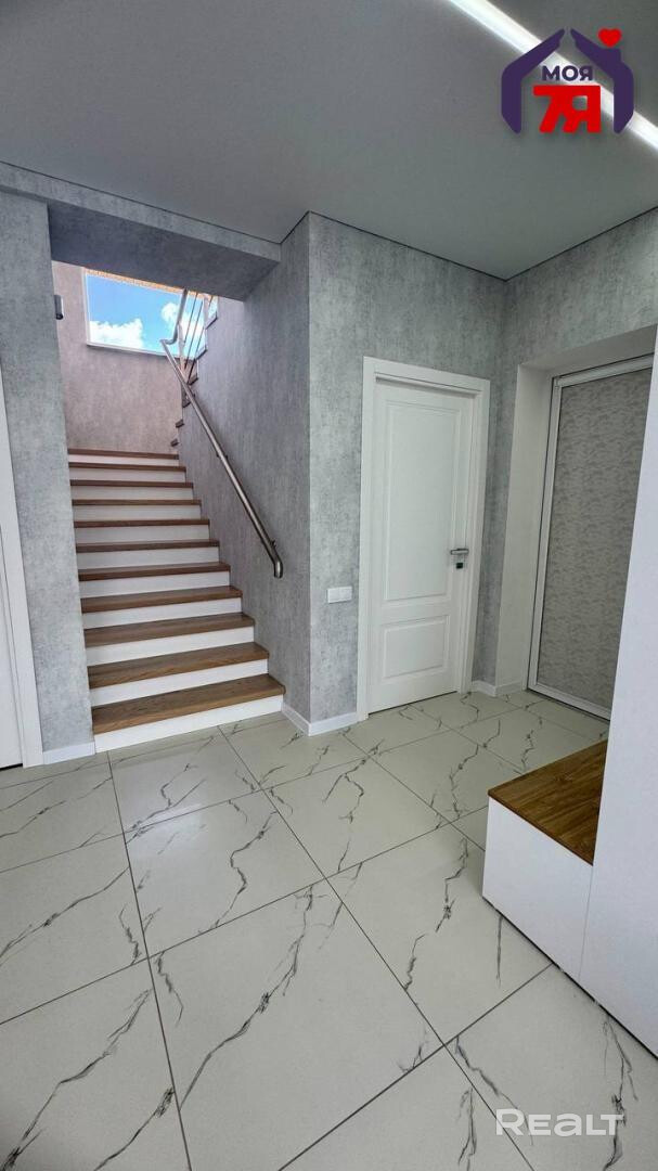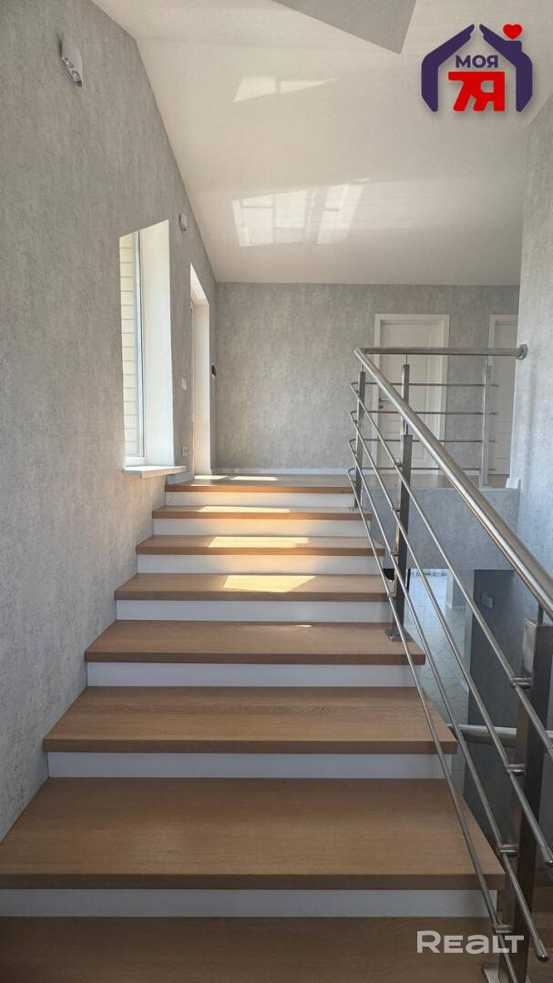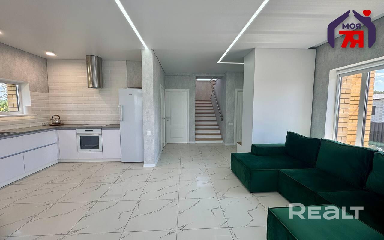 Общая площадь дома — 156,1 м2, жилая площадь 65,5 кв.м.,большая кухня-гостиная 47,5 м2, два санузла, удобная планировка, продуманные зоны хранения. На первом этаже — большие окна с видом на природу, тёплые полы по всей площади, стильная отделка. Монолитная лестница с дубовыми ступенями, современная кухня с техникой.