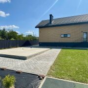 Тротуарная плитка, хвойные посадки, откатные ворота, подсветка фасада, фундамент под баню с подведёнными коммуникациями.