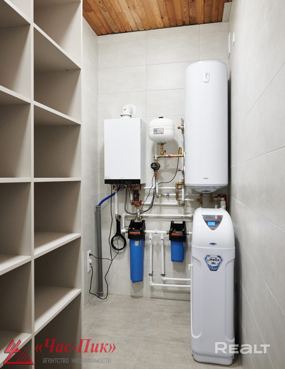 -Современная топочная с погодозависимой автоматикой, газовый котёл с бойлером, насосные группы, водяные тёплые полы, датчики управления температурой;