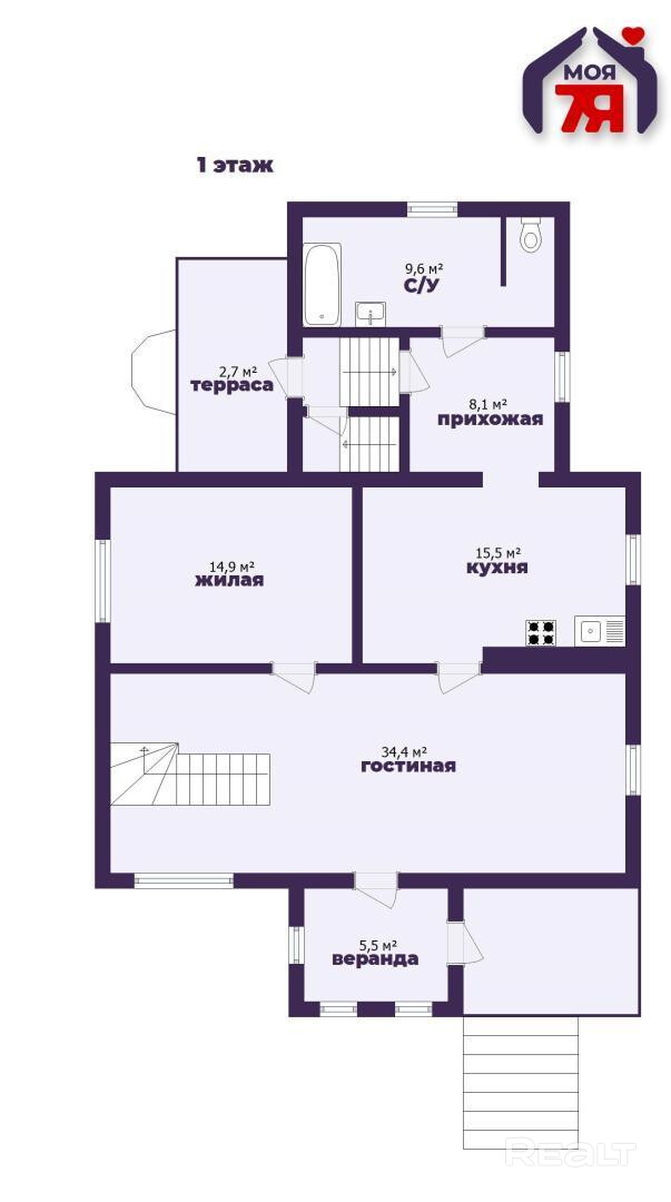 -Уже на первом этаже вас встретит просторная гостиная площадью 34 м2 — идеальное место для встреч с семьей и друзьями. Рядом находится уютная кухня (16 м2). Так же на первом этаже расположен совмещенный санузел площадью 10 м2 с теплым полом.