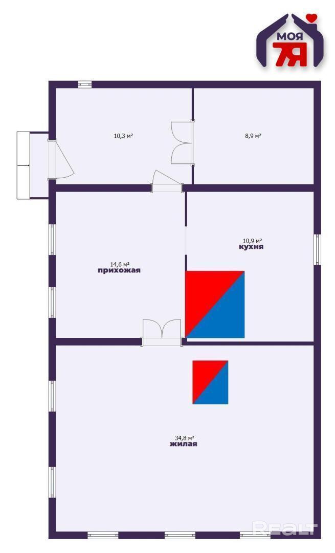 - Общая площадь дома составляет 79,5 кв.м., включая жилую площадь 34,8 кв.м. и просторную кухню 10,9 кв.м.