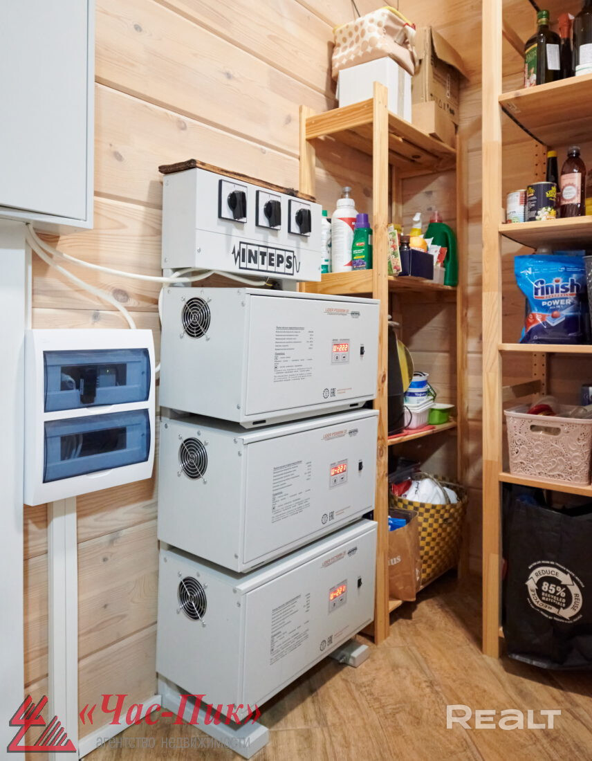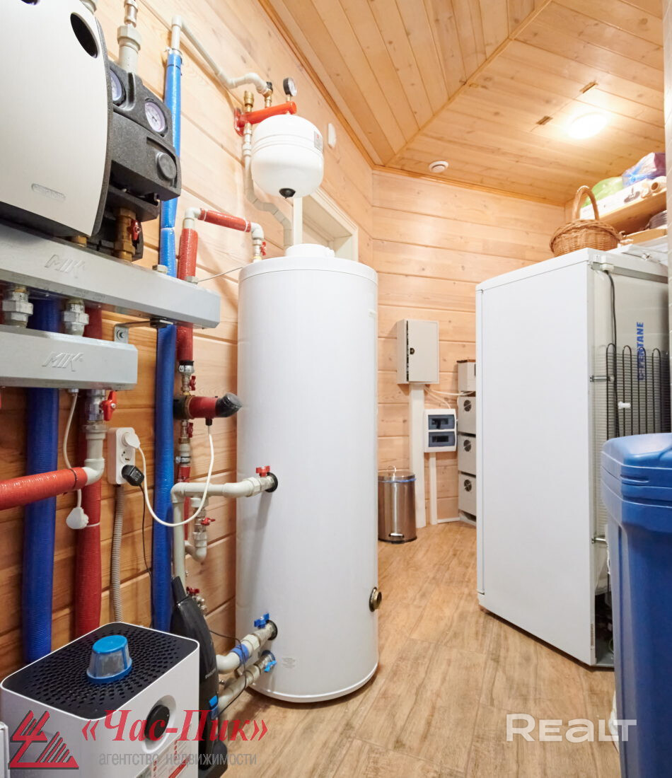 -Современная топочная с погодозависимой автоматикой, насосные группы, радиаторы, водяные тёплые полы, бойлер, стабилизатор напряжения 380, датчики управления температурой, химводоподготовка;