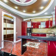- открытое пространство: плавно перетекающие кухня-столовая (20 кв.м) и гостиная (45 кв.м) с большими окнами;