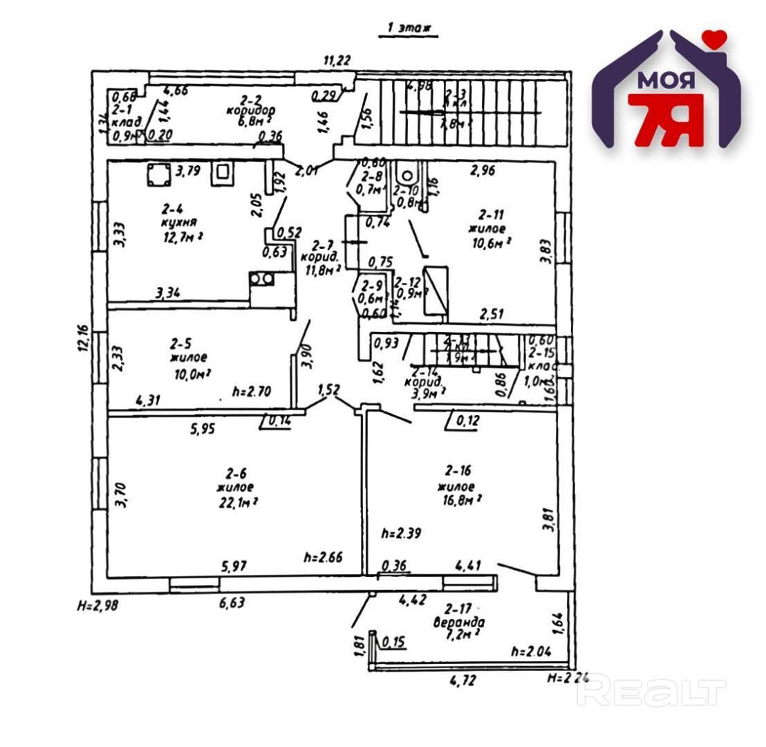- Продуманная планировка, выполнено грамотное зонирование. В доме 3 изолированные комнаты (22,1 кв.м., 16,8 кв.м. и 10,6 кв.м.), комфортная кухня площадью 12,7м2, большая ванная комната площадью 10,6 к.в.м.