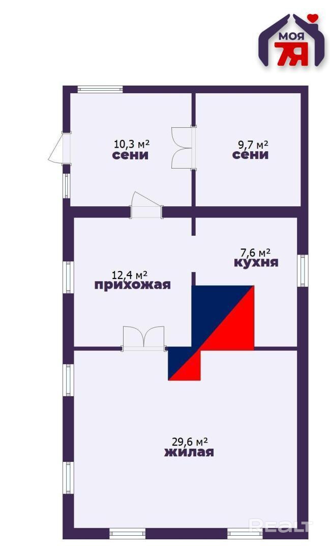 - Планировка дома состоит из одной жилой комнаты открытого пространства – 29,6 м2, двое сеней 10,9 м2 и 9,7 м2, прихожей 12,4 м2 и кухни 7,6 м2, где принимать гостей будет одно удовольствие.