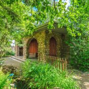 Все постройки выполнены в замковом стиле с использование традиционного для этого стиля материала – цельного бута, заявленного сразу на ограде, смотрящей на улицу. Далее огромные камни, бутовый фундамент дома с чёрным входом в дом, напоминающим сказочную пещеру, бутовый водоем со ступенями и перилами из нержавеющей стали глубиной 3м и с вытекающим из него ручьем в каменном русле с бутовым мостиком и базальтовой кладкой, бутовые стены беседки, портала флигеля и даже… дворового туалета с компостной ямой. Это надо видеть!