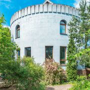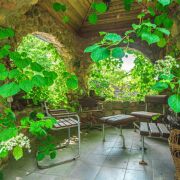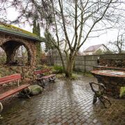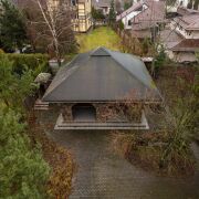 В саду три зоны отдыха – крытая в портале флигеля, открытая под раскидистым деревом грецкого ореха у барбекю и на лужайке с базальтовым диваном (летом можно греться, как на печи, и зимой теплый, если солнце и убрать ночной снег) со стационарным кострищем для вечерних посиделок с друзьями. По саду разведена вода. Открытая душевая с солнечным подогревом воды прячется в туях. Парадный вход в дом начинается с увитой многолетней цветущей лианой гортензии лестницы, ведущей на крыльцо с открытой террасой.
