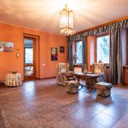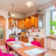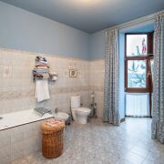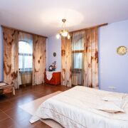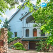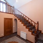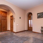 На втором этаже: 2 спальни, одна из которых с балконом; кабинет; туалетная комната с эркером с большой ванной, биде, сантехника – французская керамика и эмалированный чугун, немецкие смесители, две смежные гардеробные комнаты: одна из которых имеет встроенный гардероб для хранения сезонной одежды и отапливаемую лежанку, отделанную рваным гранитом и столешницей из резаного гранита, вторая представляет обширный гардероб общего порядка.