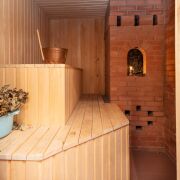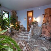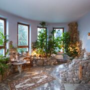 Зимний сад с обильной растительностью, позволяет зимой чувствовать себя на курорте, чему способствует экономичный мощный котел, способный обогревать многоэтажный дом. Благодаря тому, что трубы идут в центре дома, а отопительные батареи снабжены отражателями из полированной нержавеющей стали, тепло не теряется для обогрева улицы. В коридоре цоколя, санузлах, раздевалке и комнате отдыха сауны теплые полы. Вентилируемый подвал с грубкой.