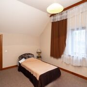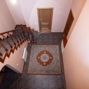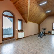 На мансарде с лестничной площадки вход в просторный холл для общения с лестницей, ведущей на площадку с выходом на башню (открытый солярий), 2 спальни, тренажёрный зал с двумя балконами, один из которых с видом на лес, луга, Криничное озеро с лебедями и восходящим над всем эти великолепием солнцем, второй с урбанистическим видом на столицу в ночных огнях.