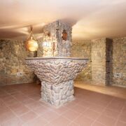 Цокольный этаж: котельная, длинный широкий коридор, ванная комната (французская керамика и эмалированная ванна стандартных размеров), туалетная комната (угловой керамический умывальник, французские керамические биде), сауна со специальными кремниевыми камнями, позволяющими париться по финскому типу с аромамаслами, а также создавать мокрый пар, комнату отдыха с кирпичным камином портал которого закрыт ажурными чугунными дверцами, плитой для приготовления пищи, в которой предусмотрена коптильня, эксклюзивной основательной мебелью, вентилируемый бутовый винный погреб с барной стойкой, гараж на две машины с оборудованной инструментами и электрощитами мастерской, гостевой гардероб, лестница в подвал.