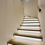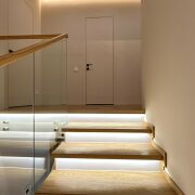 Натуральный дуб, подсветка под каждой ступенькой, закалённое стеклянное ограждение.