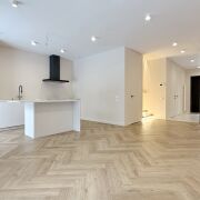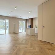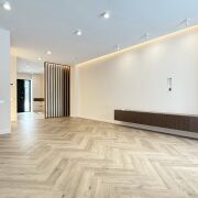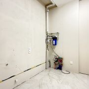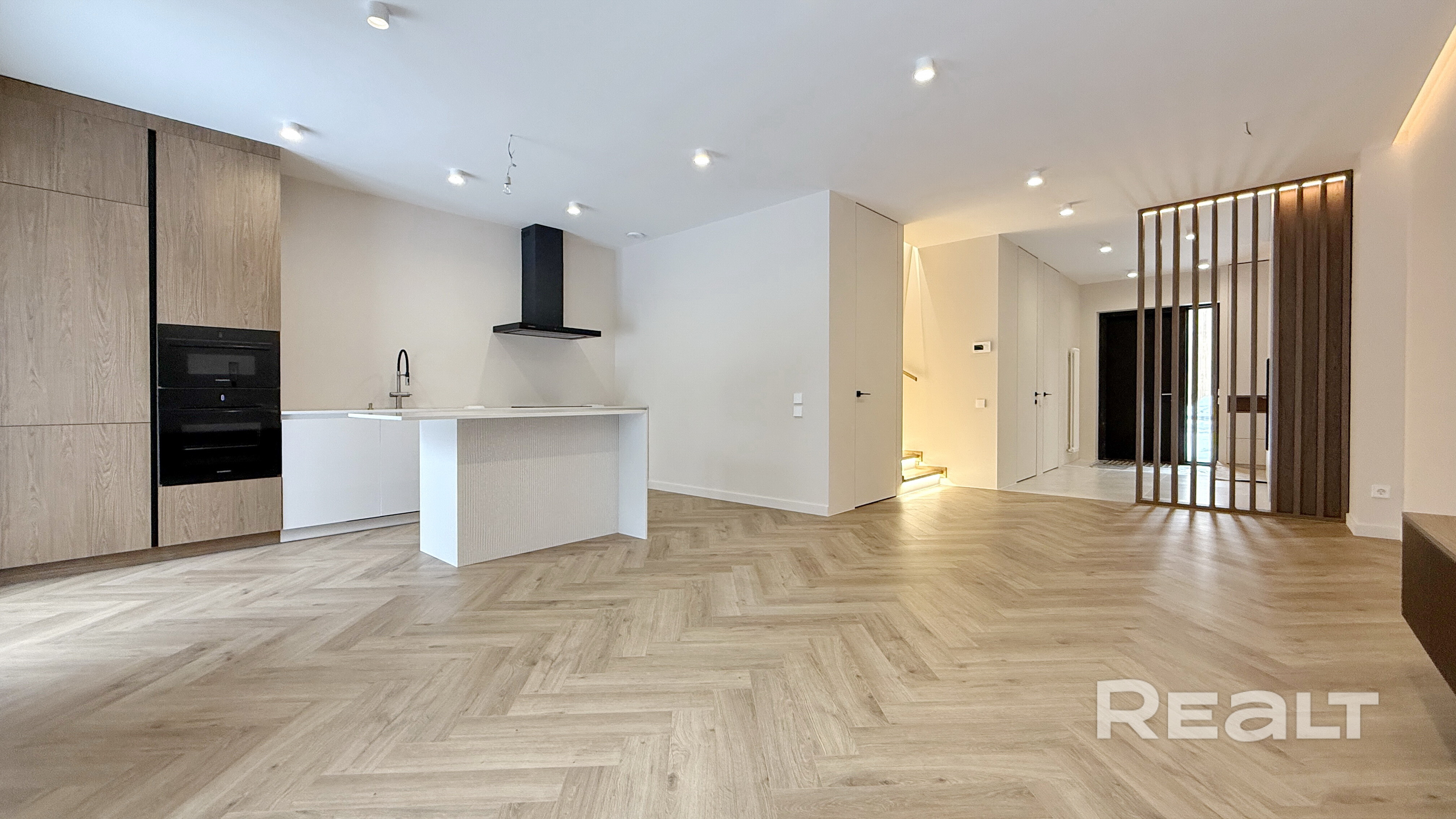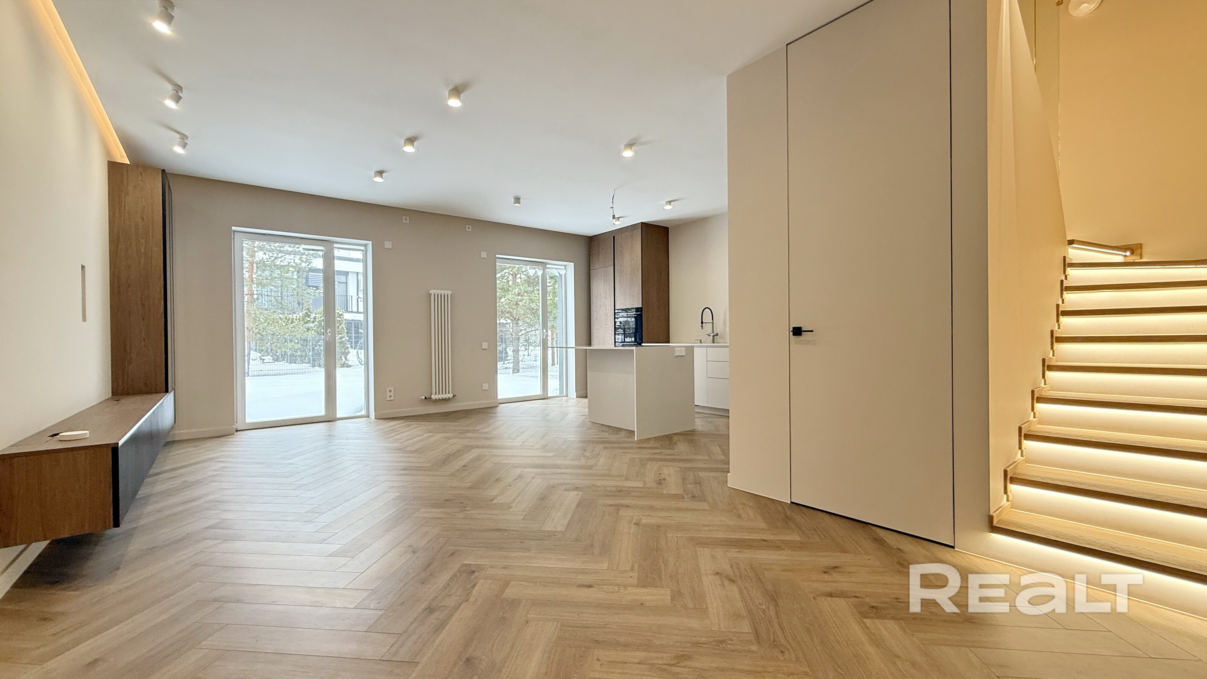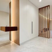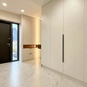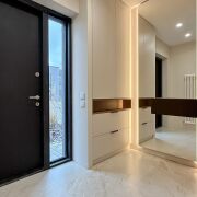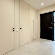 Вас встречает просторная прихожая (11,5 м2) с огромным встроенным шкафом с зеркалом в пол и теневой подсветкой. Двери скрытого монтажа в потолок создают эффект идеально гладких стен.