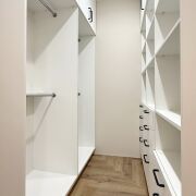Спальня родителей (16,5 м2 + гардеробная 4 м2): В спальне уже есть встроенная мебель - прикроватные тумбочки, тумба под телевизор. А в личной гардеробной - не только системы хранения, но и оборудованное рабочее место.