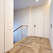 На втором этаже тоже двери скрытого монтажа и ламинат в комнатах, плитка в санузле.