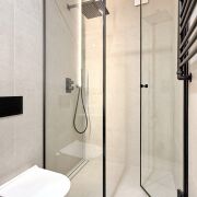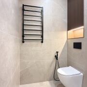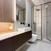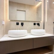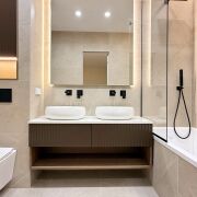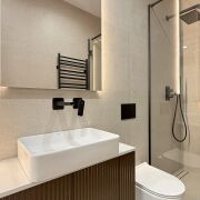 Гостевой санузел: душевая кабина, встроенная мебель, каменная столешница, нишевое освещение и высокое зеркало с теневой подсветкой.