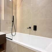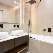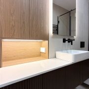 Санузел на втором этаже: ванна, встроенная мебель, каменная столешница, нишевое освещение и большое зеркало с теневой подсветкой.
