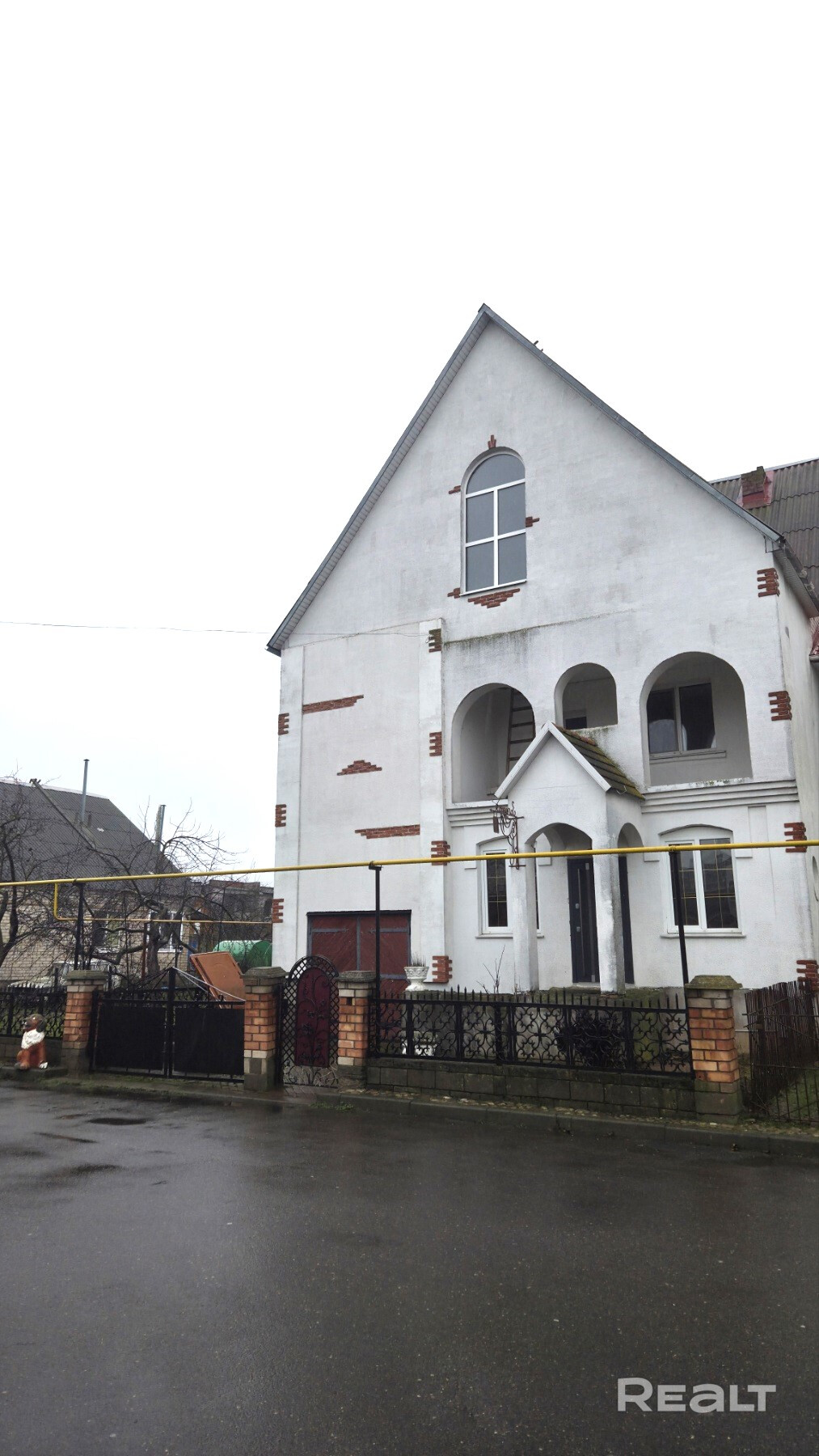 По периметру установлен забор: бетонные блоки, столбы из кирпича и кованный метал в пролётах.