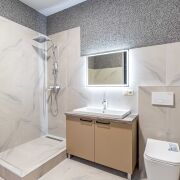 Водяные теплые полы в кухне-гостиной, холле – кварц винил. Санузлах, котельной, уложены плиткой. Жилые комнаты ламинат и радиаторы отопления.
