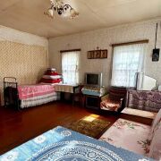 - Дом построен из бревен, с высоким фундаментом, что гарантирует его долговечность и отличные теплоизоляционные характеристики. Полы из деревянной доски, а стены обклеены обоями.