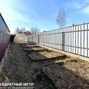 - Вся территория огорожена забором из металлопрофиля, а с улицы деревянная шахматка с зазорами на опорных столбах. На участок есть два заезда: основной, с улицы, через откатные автоматические ворота, и технический заезд, с откидными воротами.