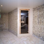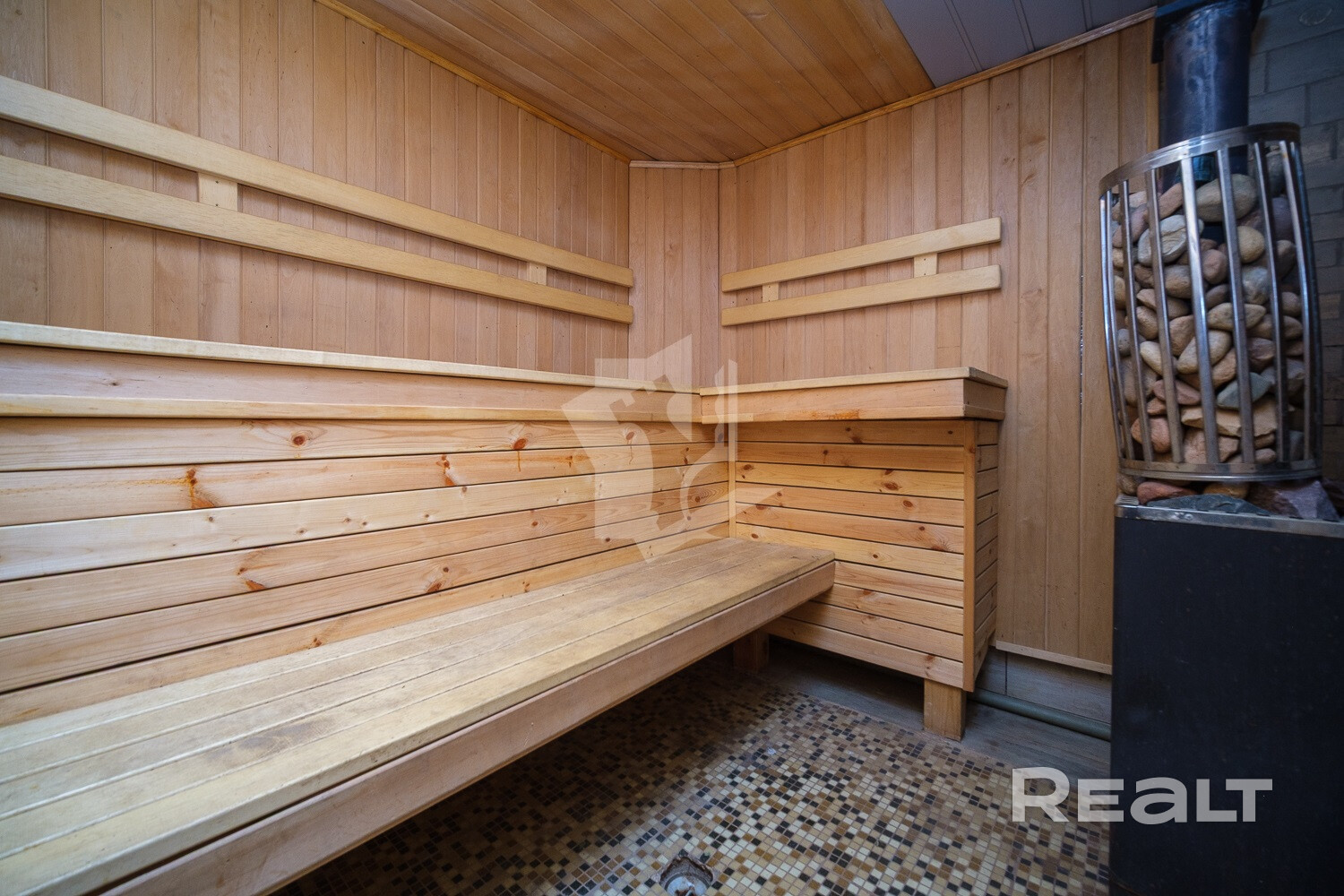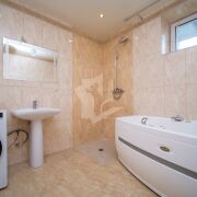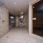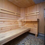 На цокольном этаже гараж с секционными воротами, бойлерная, санузел, комната для отдыха (тренажерный зал), баня (дровяная печь), душевая с бассейном (требует доработки).