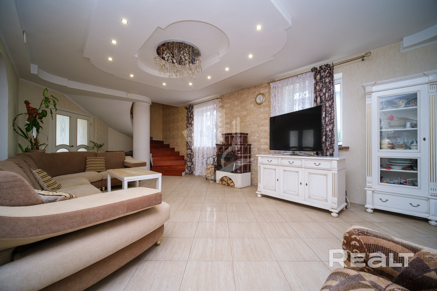 Лестница на второй этаж из ясеня, все двери и подоконники из ольхи (натуральное дерево).