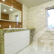 - В доме 1 жилой этаж с 2-мя большими спальнями 17 и 21 м.кв., кухня-гостиная в 36 м.кв., на мансардном этаже ещё одна жилая комната в 18 м.кв., совмещённый санузел, холл и коридор. На кухне и в санузлах уложена современная плитка, в комнатах ламинат.