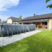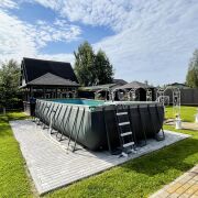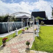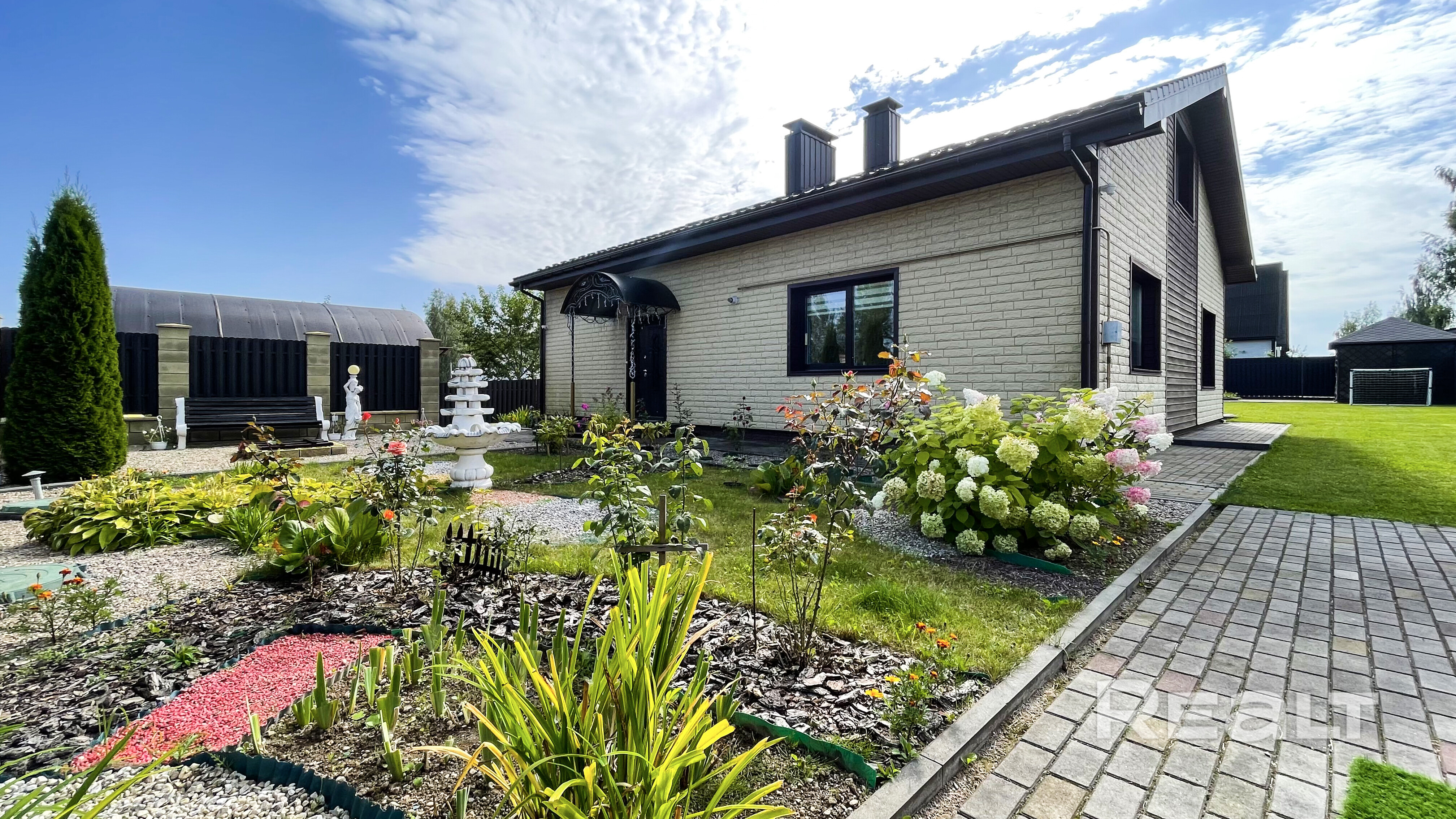 -Земельный участок 10 соток (частная собственность), ландшафтный дизайн; газон, уличный бассейн, беседка, хозблок, навес (на 2 машины), парковка (на 2 машины), декоративное освещение, деревья, цветы, мощение тротуарной плиткой;