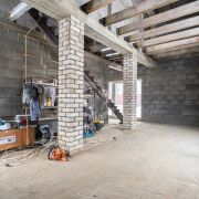 - Полы 1-го этажа — черновой бетон; в одной половине установлен металлический каркас лестницы.
