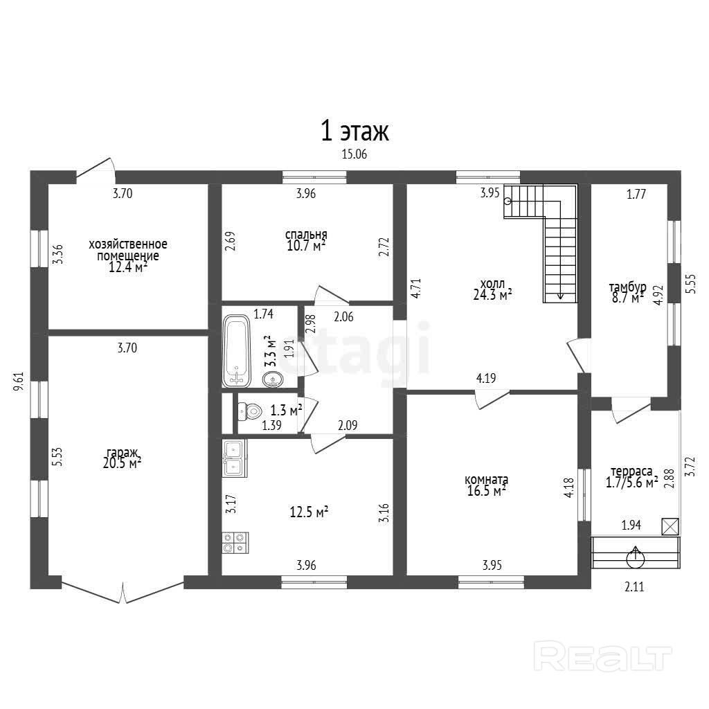 2 жилые комнаты (16.5 м2 и 10.7 м2), холл - 24.3 м2, кухни - 12.5 м2, раздельного сан.узла, террасы, тамбура, хоз.помещ. - 12.4 м2, гараж - 20.5 м2.