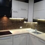 Особое внимание было уделено зоне для телевизора , где использован декоративный камень, добавляющий шарма и элегантности интерьеру.