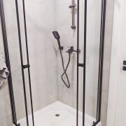 В ванной установлен электрополотенцесушитель, душевая кабина, инсталяция, стиральная машина.