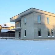 Стены: газосиликатные блоки 400 мм + утепленный и оштукатуренный фасад.