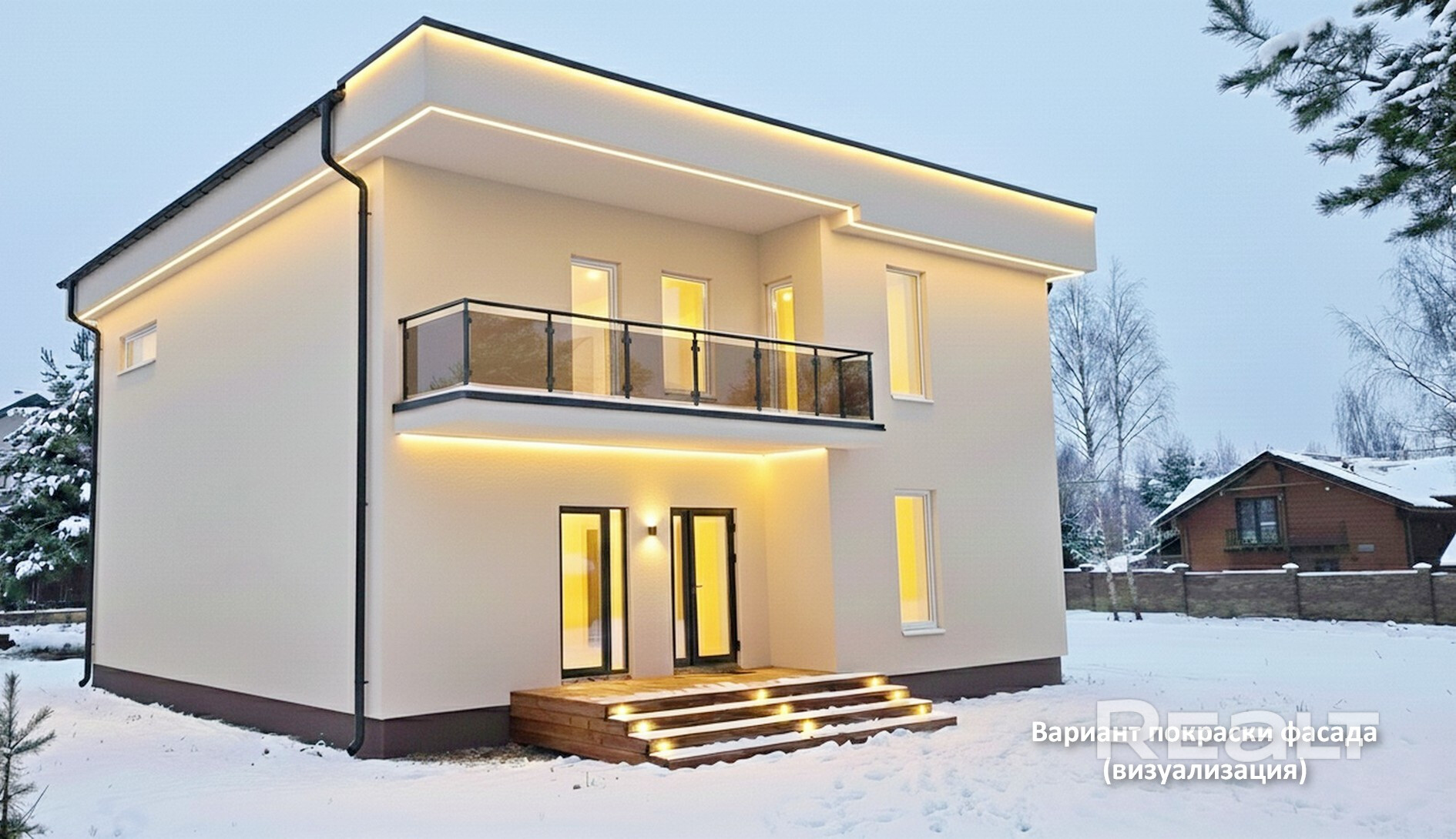 Главный дом 218 м2: Современная архитектура, плоская кровля, панорамные окна от бренда Salamander (76 мм). Высота потолков — почти 3 метра, что создает ощущение простора и свободы.