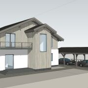 Два этажа и цокольный этаж, устроенный по принципу шале. С обратной стороны, дом выглядит как трехэтажный.