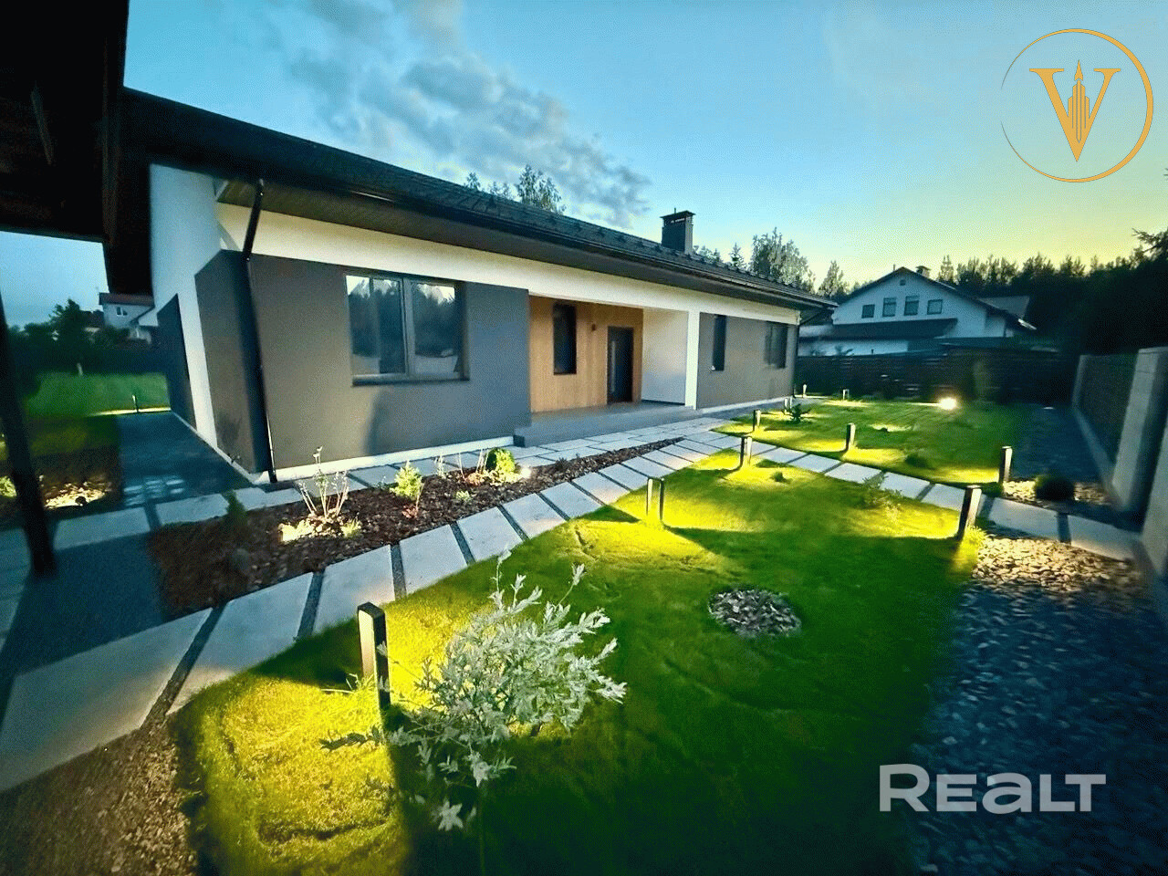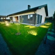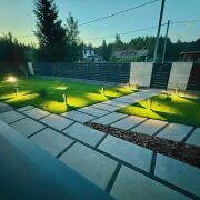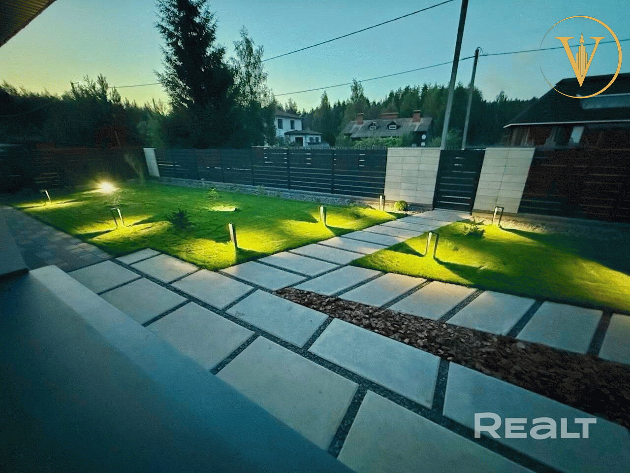- Улица – ворота откатные с надежным приводом Nice, забор ранчо из немецкой стали Arcelor, столбы из бессерных блоков Польша, уличное освещение, рулонный газон, зональный автоматический полив погодозависимый, тротуарная плитка, бетонные шлифованные пошаговые дорожки крупноформатные из мостового бетона, ливнеприемники, щебень.