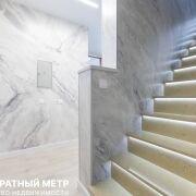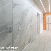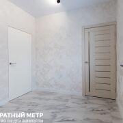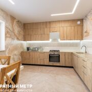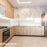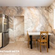 Установлена встроенная кухня с техникой европейских производителей: варочная поверхность, духовой шкаф, посудомоечная машина, вытяжка. Столешница —натуральный мрамор. Встроенные шкафы решают вопрос хранения.