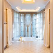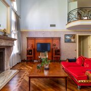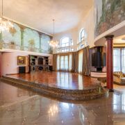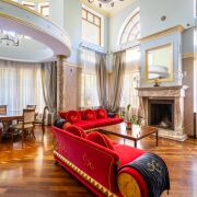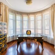 -Первый этаж. Просторная гостиная, оборудована зоной отдыха у камина, панорамные окна и высокие потолки дают ощущение невероятного простора. Периметр гостиной поддерживают колонны. При входе располагается гостевой санузел и декоративные зоны хранения. Хозяйская спальня находится слева от входа, полностью мебелирована, оснащена 2 гардеробными,2 санузлами, джакузи и душевой кабиной. Есть персональный выход на террасу с бассейном и зоной барбекю. По правой стороне располагается лестница, соединяющая цокольный и второй этажи. Пройдя немного вперед ,Вы попадете на кухню-гостиную. Кухня оснащена всем необходимым оборудованием и техникой, так же здесь распологается камин, у окна- обеденный стол, диваны ,стол и шкафы. Так же из кухни есть свой выход на территорию. Правее- выход в кабинет, еще одну комнату хранения и так же выход на крыльцо дома.