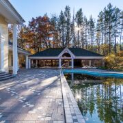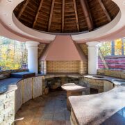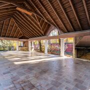 - Навес с камином и зоной барбекю -180м.Отлично подходит для масштабных мероприятий и праздников на воздухе. Рядом с навесом находится пруд, кованный мостик соединяет нас с еще одной постройкой, которая может стать идеальным вариантом для проведения праздников и отдыха в холодное время. Прогулявшись вдоль деревьев Вы попадете к автоматическим воротам и 4 гаражам , один из которых построен для парковки лимузина.