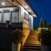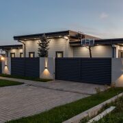 Забор: Откатные ворота на пульте, видеодомофон с возможностью открывания калитки с телефона, декоративная подсветка забора.