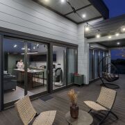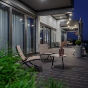 Терраса: Выполнена из террасной доски, наличие локальной подсветки, садовая мебель, розетки.