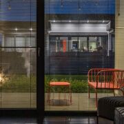 Гостевая комната: Просторная комната с кухне, новой бытовой техникой, местами хранения, локальной подсветкой, экраном для просмотра проектора, панорамными окнами с видом на дом и деревья.