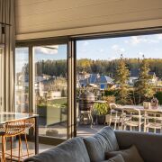 Панорамные деревянные окна: Окна и двери выполнены из натурального дерева, обеспечивая тепло и уют в доме.