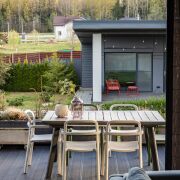 Терраса: Терраса выполнена из террасной доски. Установлены кашпо из бетона от компании BetOn и засажены растениями которые цветут в разные периоды, тем самым вид из окна меняется в каждую пору года. Зона отдыха с зоной-барбекю, уличная мебель (стол на 12 персон, удобные кресла)