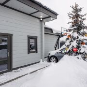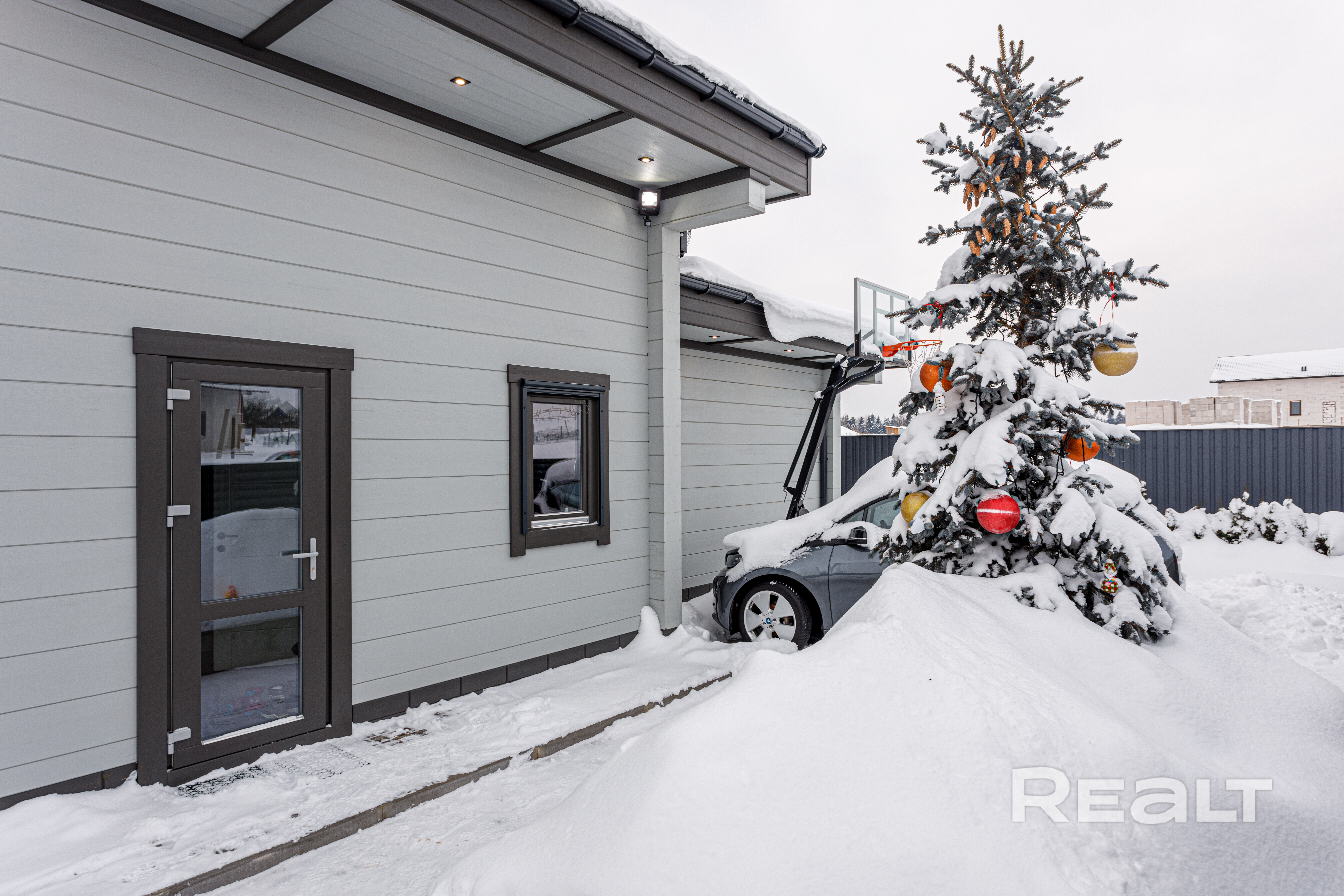 Озеленение: Деревья и кустарники, вдоль забора высажены взрослые и высокие туи, за забором – ели. Территория перед домом также облагорожена: газон, насаждения, парковка на две машины.